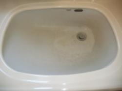 石鹸カスがこびりついて黄ばんだ洗面ボールの清掃